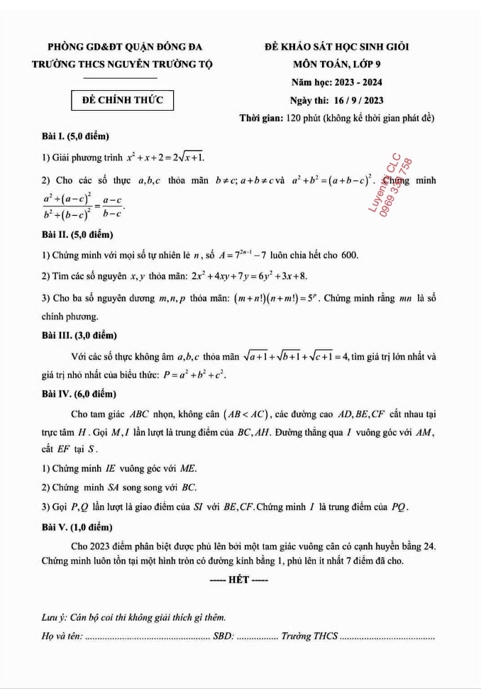 Đề khảo sát HSG môn Toán lớp 9 Trường THCS Nguyễn Trường Tộ, quận Đống Đa, Hà Nội năm 2023