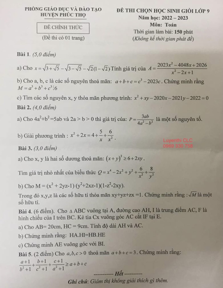 Đề thi chọn HSG môn Toán lớp 9 huyện Phúc Thọ, Hà Nội năm 2022