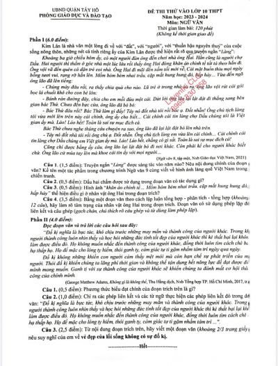 Đề thi thử vào lớp 10 THPT môn Ngữ Văn quận Tây Hồ, Hà Nội năm 2023