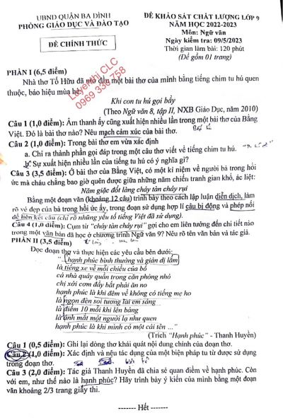 Đề khảo sát chất lượng môn Ngữ Văn lớp 9 quận Ba Đình, Hà Nội năm 2023