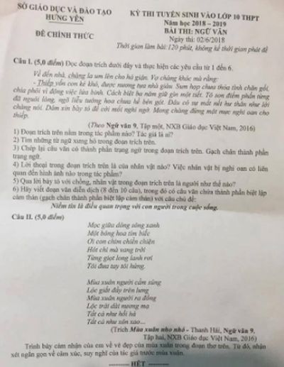 Đề thi tuyển sinh vào lớp 10 THPT môn Ngữ Văn năm 2019 tại Bến Tre