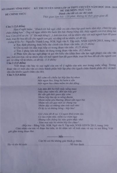 Đề thi tuyển sinh vào lớp 10 THPT môn Ngữ Văn năm 2017 Thành phố Hồ Chí Minh