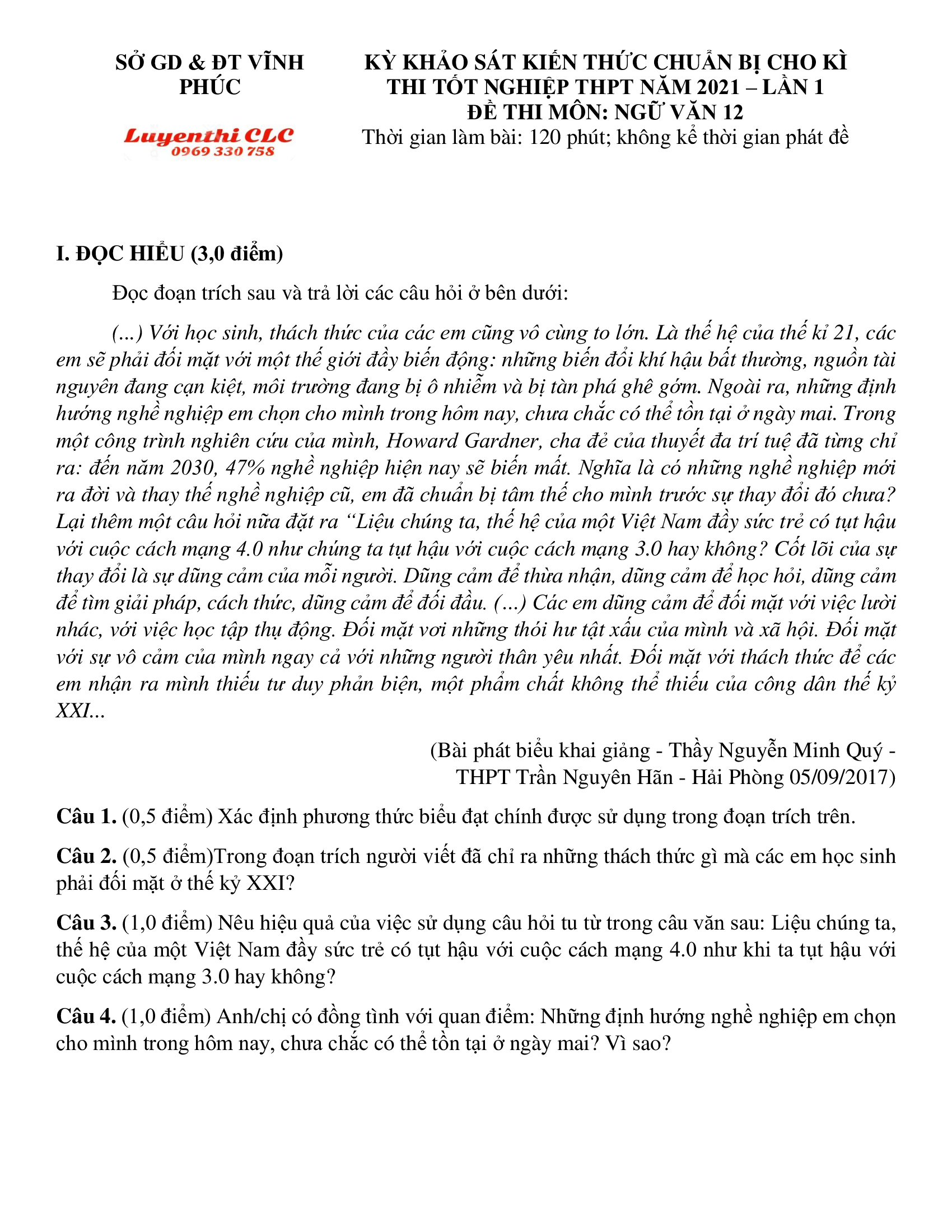 Đề khảo sát kiến thức chuẩn bị cho kì thi tốt nghiệp THPT môn Ngữ Văn lớp 12 tỉnh Vĩnh Phúc năm 2021