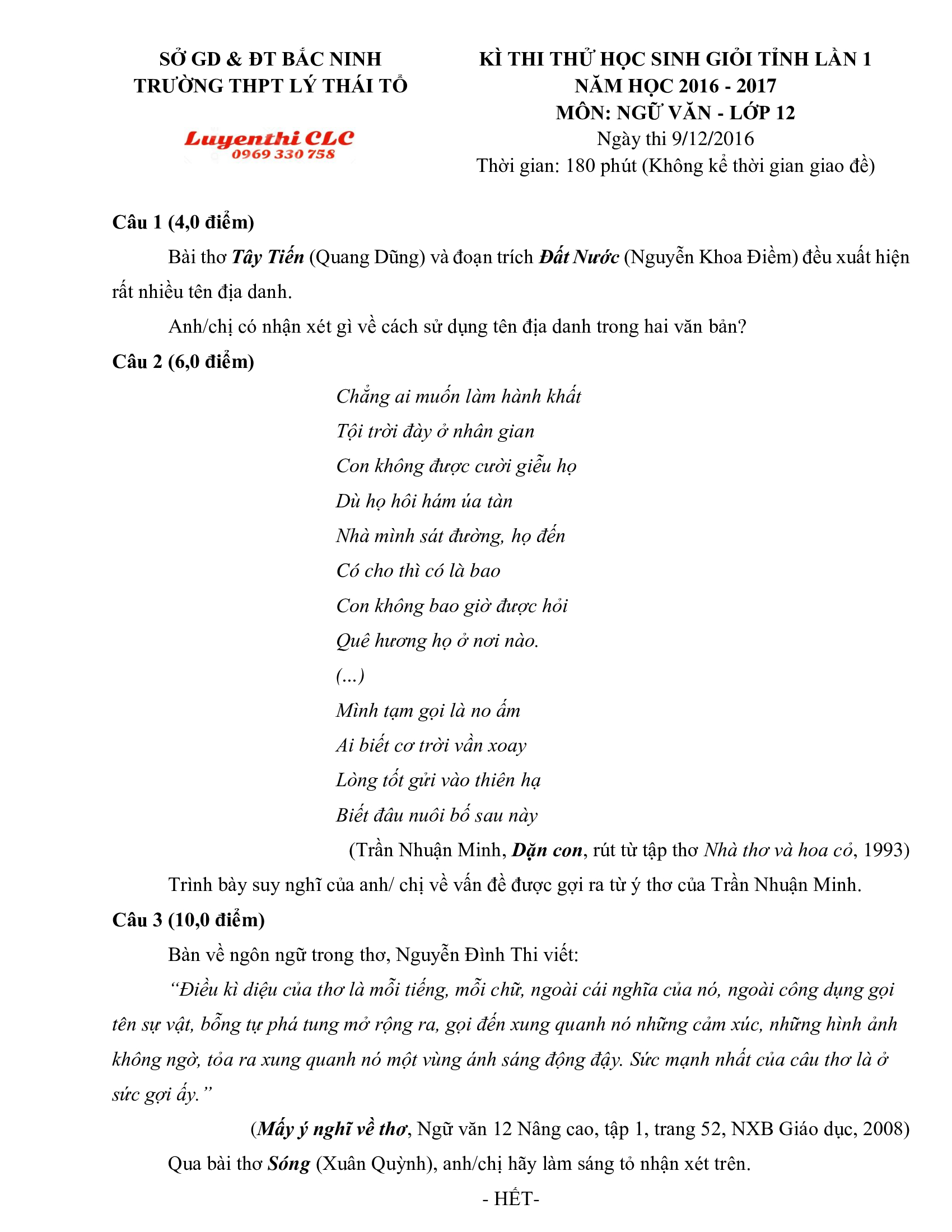 Đề thi HSG cấp tỉnh môn Ngữ Văn (lần 1) lớp 12 Trường THPT Lý Thái Tổ, tỉnh Bắc Ninh năm 2016 (Đề thi thử)