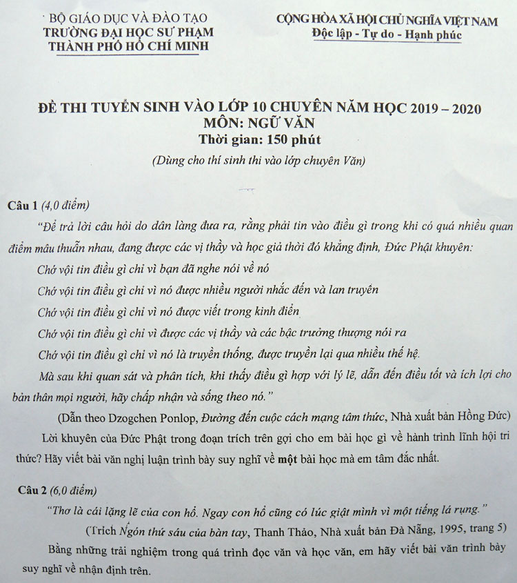 Đề thi thi tuyển sinh vào lớp 10 THPT CHUYÊN môn Ngữ Văn Trường Đại học Sư Phạm Thành phố Hồ Chí Minh năm 2019