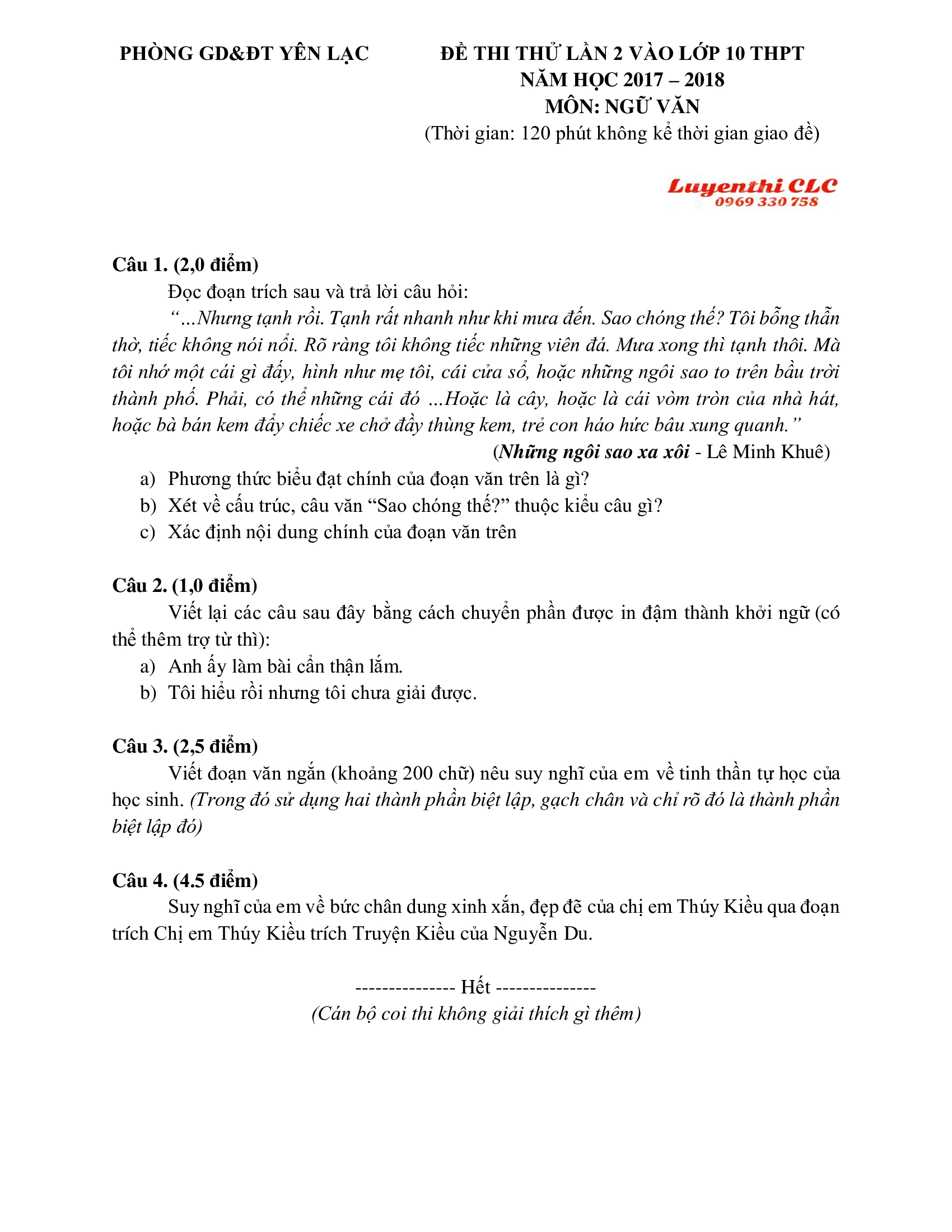 Đề thi thử lần 2 vào lớp 10 THPT môn Ngữ Văn huyện Yên Lạc, tỉnh Vĩnh Phúc năm 2018