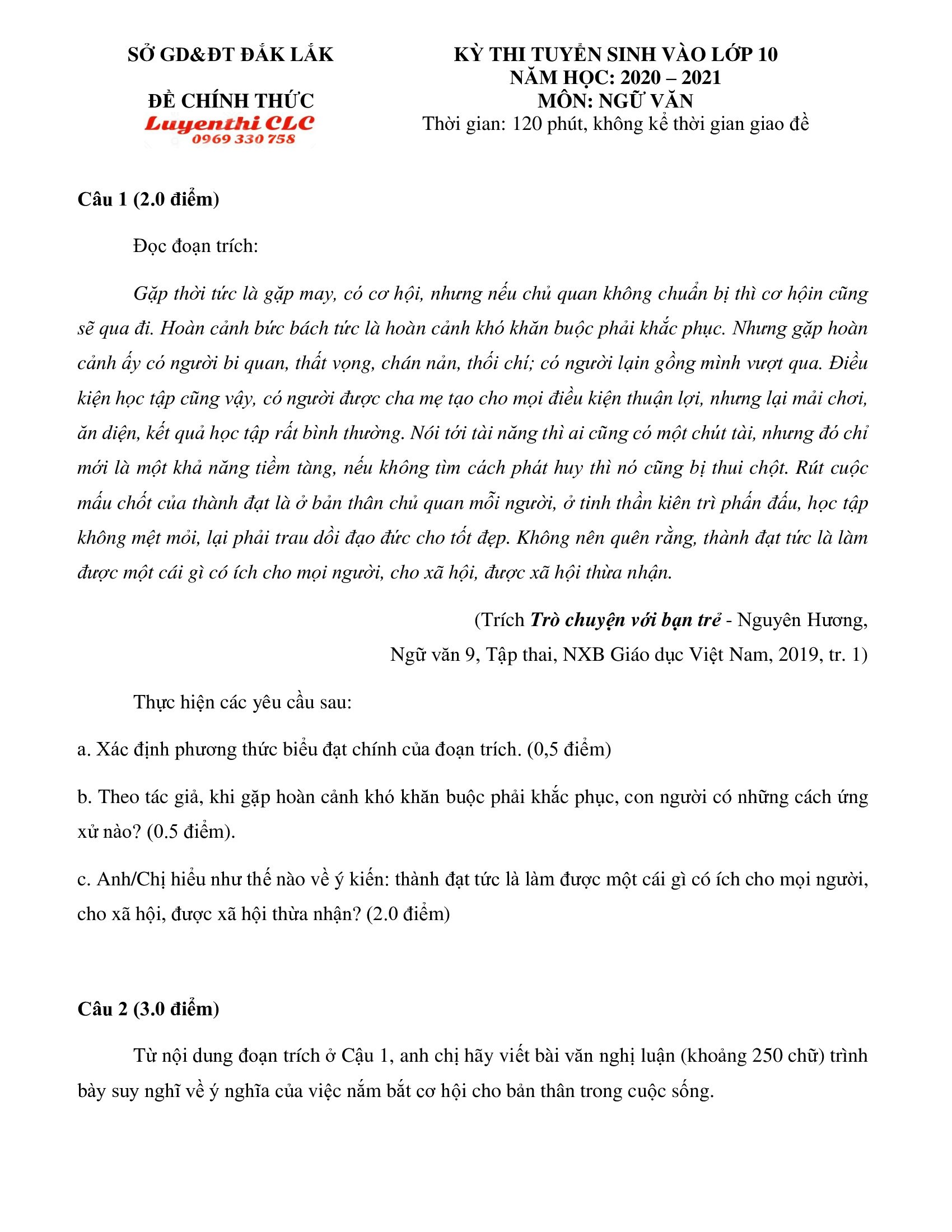 Đề thi tuyển sinh vào lớp 10 THPT môn Ngữ Văn tỉnh Đắk Lắk năm 2021