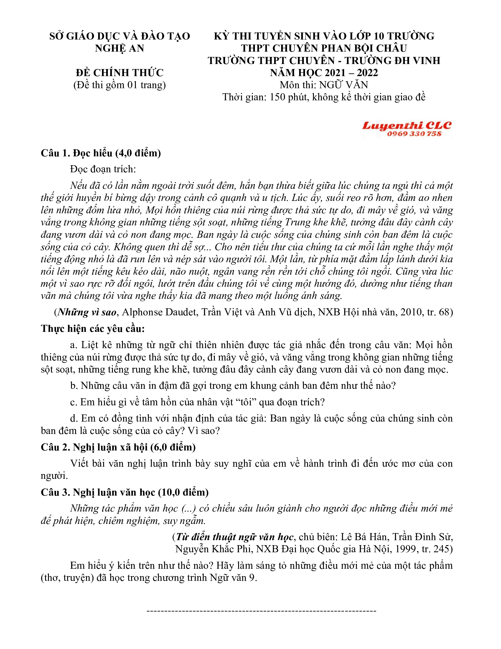 Đề thi tuyển sinh vào lớp 10 môn Ngữ Văn tỉnh Nghệ An năm 2021