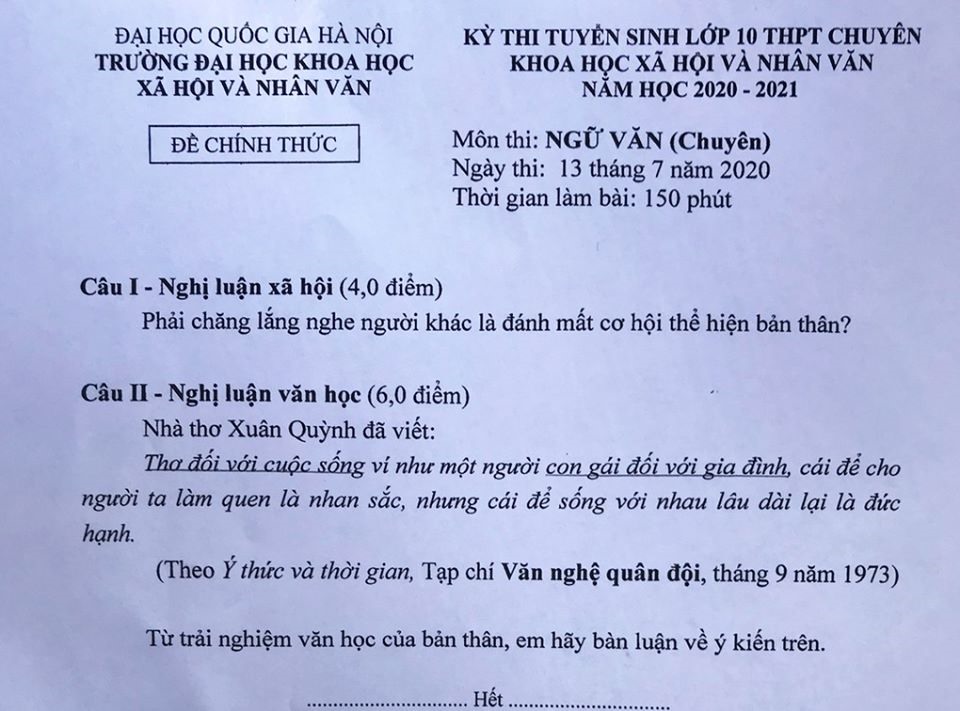 Đề thi tuyển sinh vào lớp 10 THPT CHUYÊN Trường Đại học Khoa học Xã hội và Nhân văn, ngày thi 13/07/2020