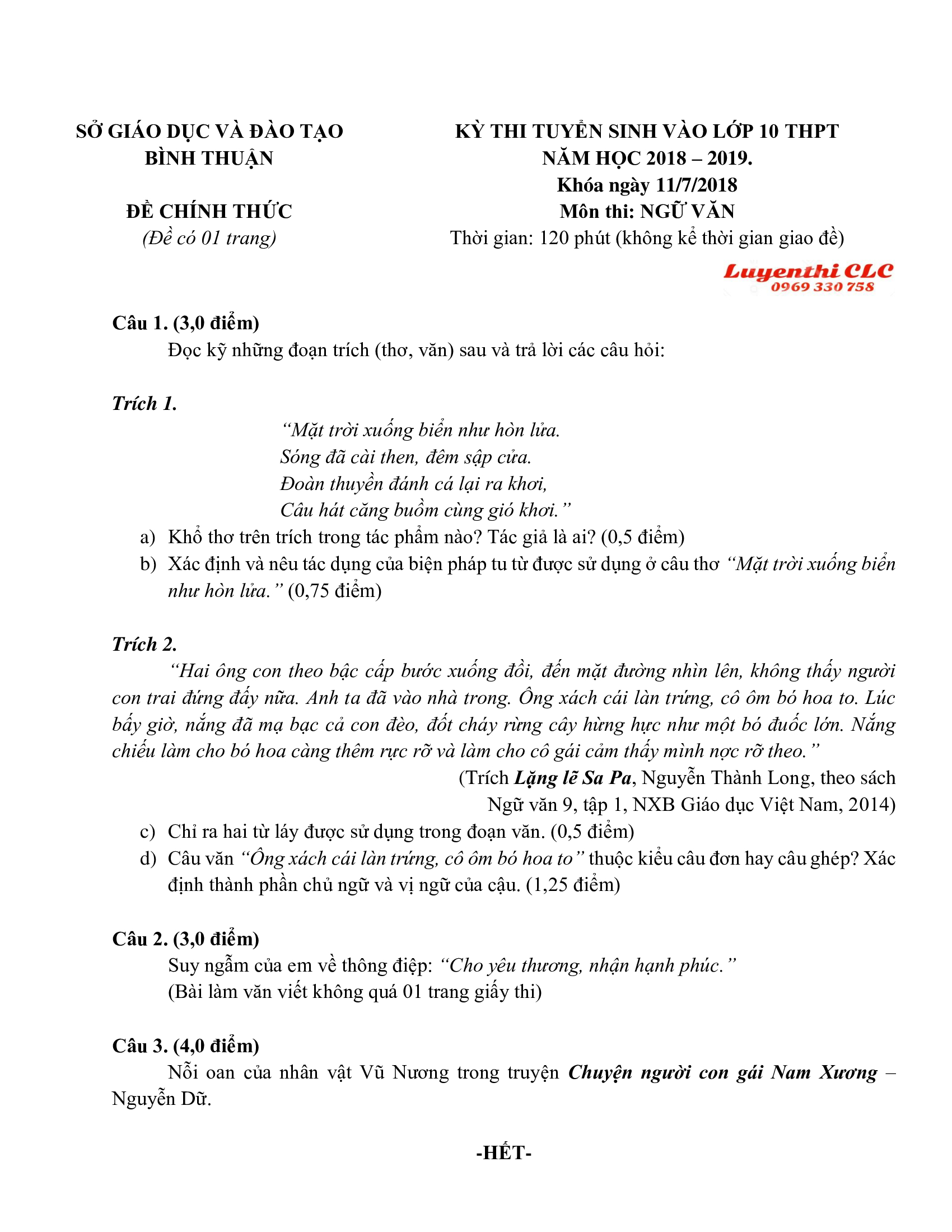 Đề thi tuyển sinh vào lớp 10 THPT môn Ngữ Văn tỉnh Bình Thuận năm 2018