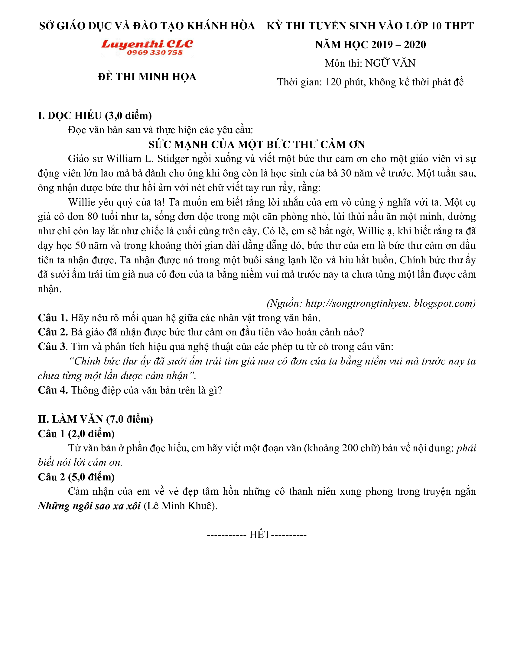 Đề thi tuyển sinh vào lớp 10 THPT môn Ngữ Văn tỉnh Khánh Hòa năm 2020