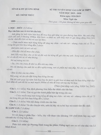 Đề thi tuyển sinh vào lớp 10 THPT môn Ngữ Văn tỉnh Quảng Bình năm 2019