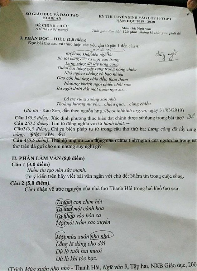 Đề thi tuyển sinh vào lớp THPT môn Ngữ Văn Tỉnh Nghệ An năm 2019